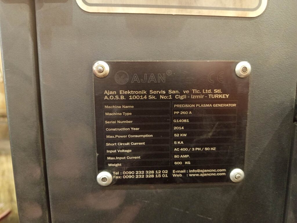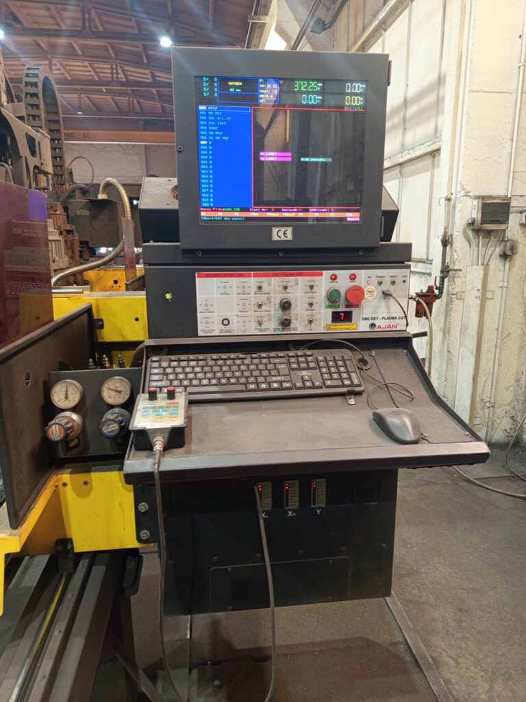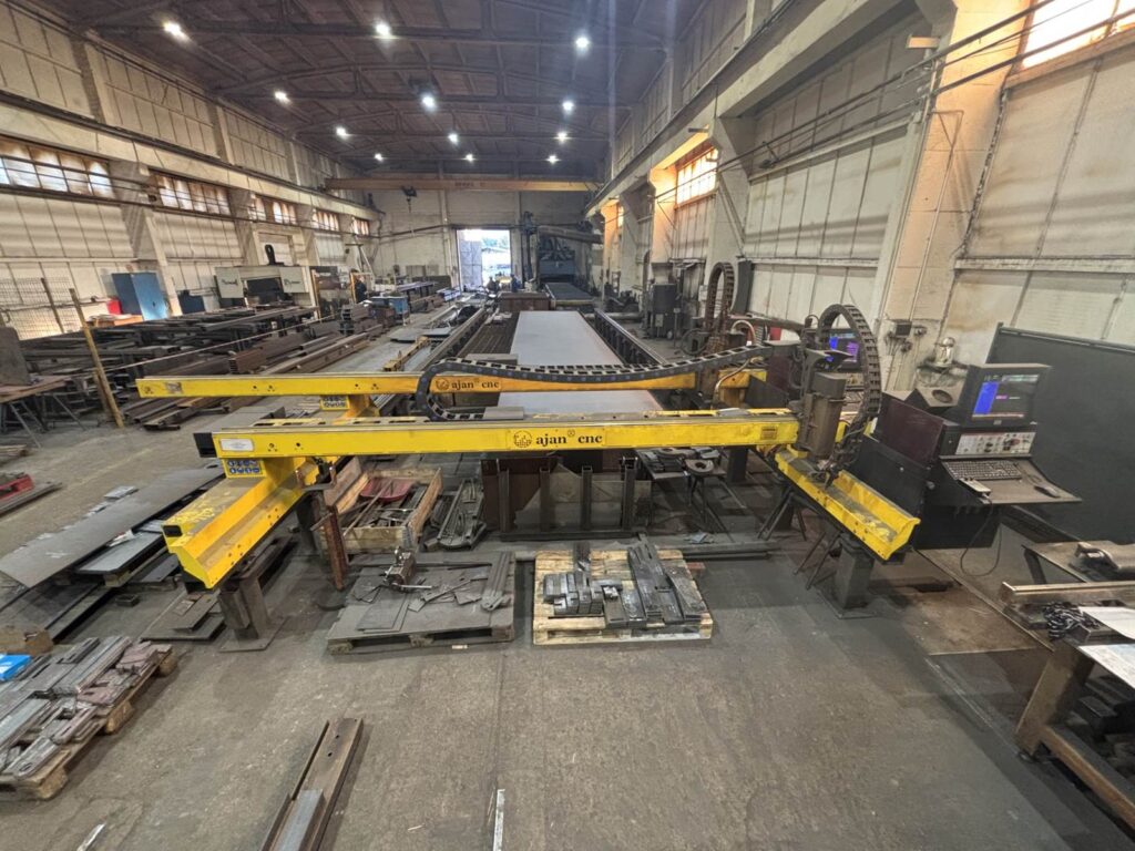 The AJAN SHP 260 plasma cutter, built in Turkey in 2014, is designed for shape cutting in details made of stainless steel, structural steel and aluminum. The contamination created during cutting is leveled by the sectioning and extraction table, increasing the safety of the operator's work. The machine has two bridges, one with a gas burner and the other bridge with a plasma burner.